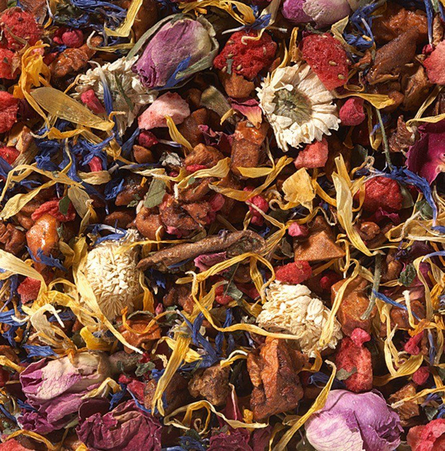 Pommes, poire, boutons de rose, fraises lyophilisées, framboise lyophilisée, arôme, feuilles de mûre, bleuet, souci, rose, camomille romaine.