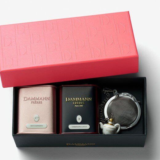 Réunies dans un coffret rose vif à une boule à thé ornée d'une théière miniature, 2 créations aromatisées emblématiques de la maison : MISS DAMMANN (thé vert aromatisé - boîte métal 30 g), JARDIN BLEU (thé noir aromatisé - boîte métal 30 g). Pour la préparation de ces thés, nous vous recommandons d'utiliser 2 g pour une tasse de 15 cl.