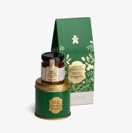 Dans une pochette cadeau décorée d'un charmant motif de feuillage hivernal, un thé vert parfumé aux notes finement épicées et fruitées offrant à l'infusion, une tasse soyeuse aux douces saveurs de cannelle, d’orange, et de cranberry conditionné dans une mini boîte métallique et accompagné d'un pot de spécialité de thé élaborée à partir du thé noir Noël à Paris. Un petit cadeau idéal pour les amateurs de thé vert et de douceurs sucrées. Pour les plus impatients d'entre nous, le cadeau parfait pour fêter le Secret Santa entre amis.