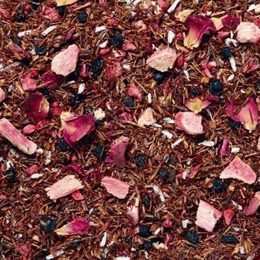 Rooibos, baies de sureau, coco râpée, arôme, morceaux de framboise lyophilisée, pétales de rose, morceaux de rhubarbe lyophilisée