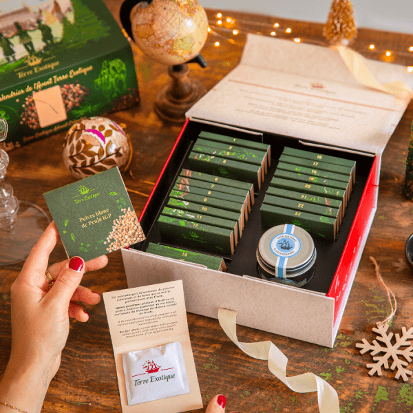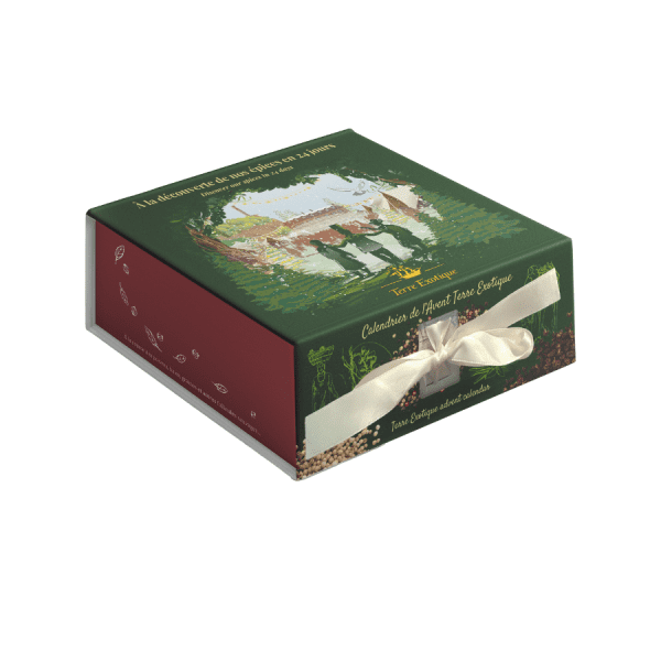 Chaque jour de décembre, laissez-vous emporter par une surprise culinaire soigneusement sélectionnée. 23 sachets découvertes et une boîte d’épice vous dévoilent poivres, baies, assemblages, sucres ou sels… une sélection précieuse, pensée pour inspirer et accompagner vos plats. Grâce aux QR codes, laissez-vous guider dans cet univers épicé : suggestions d’usages, idées recettes, associations inédites... Le coffret s’inspire de notre galerie de Rochecorbon en Touraine. Ce décor unique célèbre l’esprit Terre Exotique : patrimoine vivant, passion des rencontres et créativité culinaire. Le tout s’habille d’une ambiance hivernale et festive : toit enneigé, guirlandes lumineuses étoilées, chouettes curieuses et cerf majestueux se glissent dans le décor… jusqu’à la surprise finale du 24 décembre. Une boîte de diamant de sel à la truffe, la touche d’exception à déposer sur vos plus belles recettes de fête. Les épices à portée de main, les idées en ébullition…